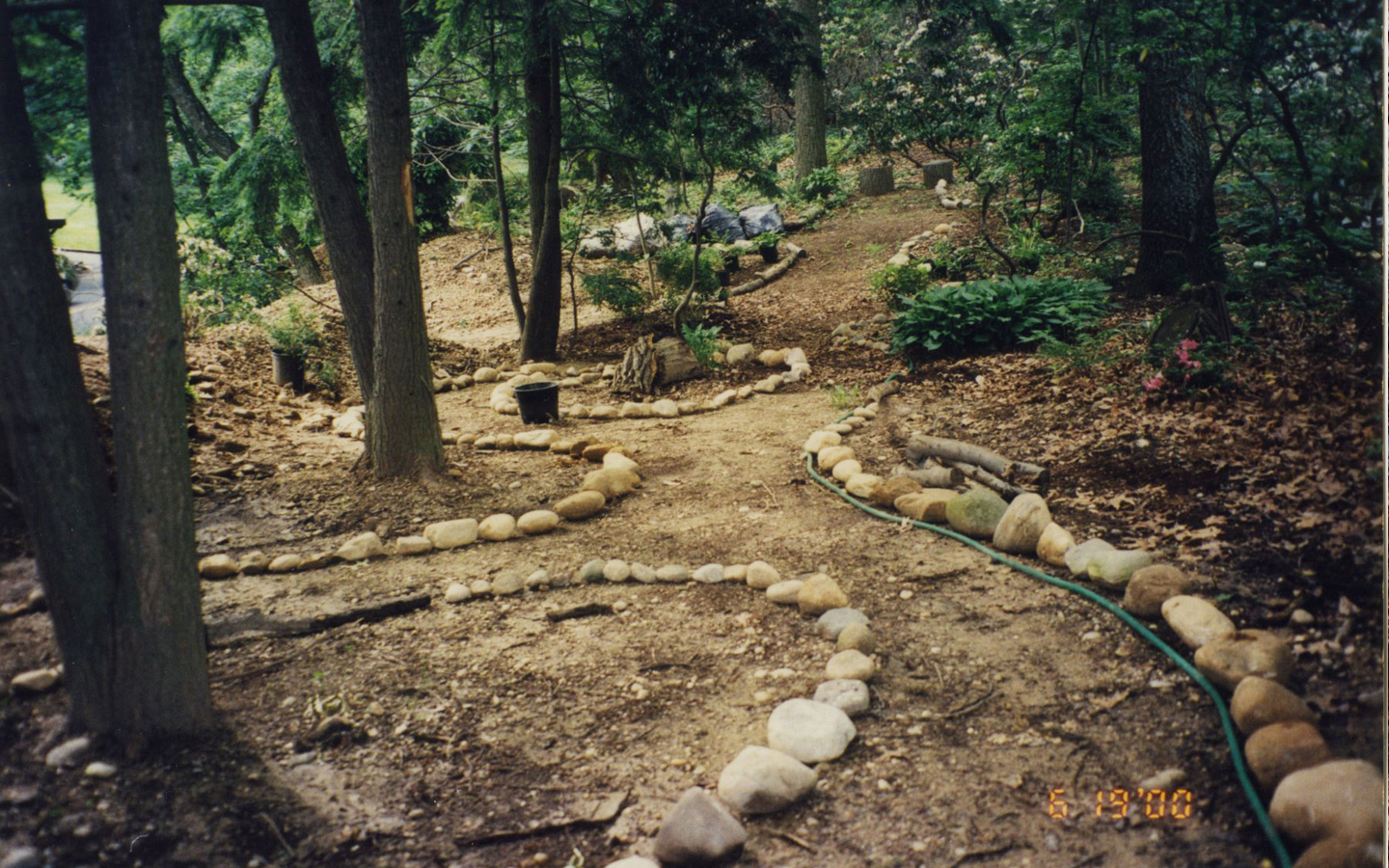 Delineating the paths I had a simple solution. With each shovel I put in the ground I removed yet another river rock. The street along one side of my garden is named Stony Hollow Road for a reason and to this day, over 30 years later, I am still removing rocks from their hiding places under the ground.