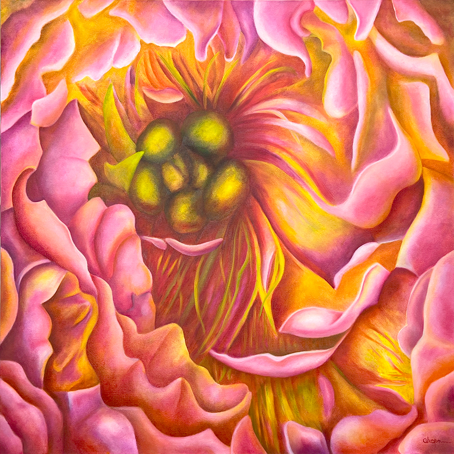 “Phantasm – Coral Sunset Peony”, a 36×36″ oil painting, is a vivid celebration of life’s vibrant energy inspired by the peonies that enchant my garden. Imagine a dynamic dance of colors—pink, yellow, and orange petals that swirl with a captivating grace, all harmoniously converging towards a lively green center. The energy in the petals encircling the center of the flower also represents the feeling humans have when they are moved by emotions. This piece is about celebrating movement and color, capturing the very essence of a flower in full bloom. It invites you to step into a world where every brushstroke is infused with the joy and wonder of nature’s beauty. I hope it inspires a moment of reflection and connection to the natural vibrancy all around us.