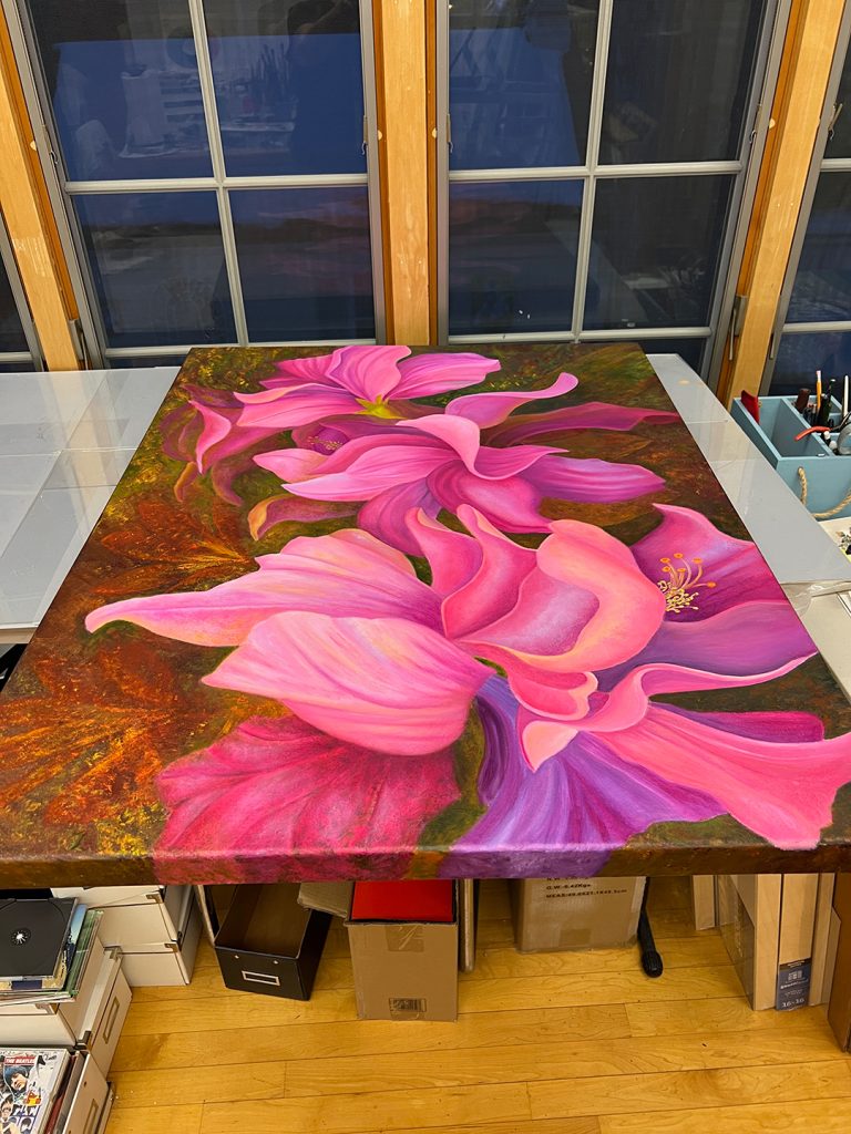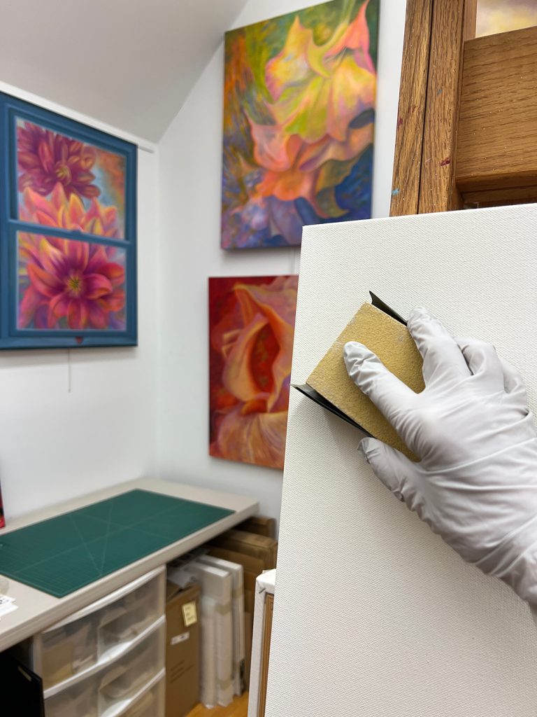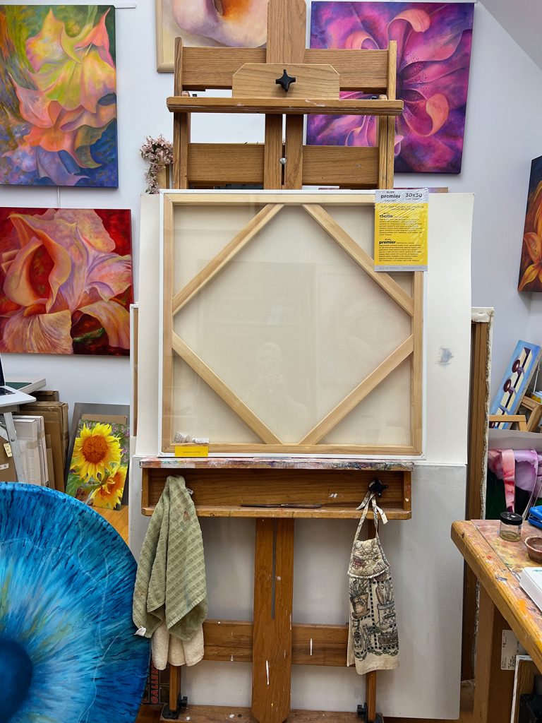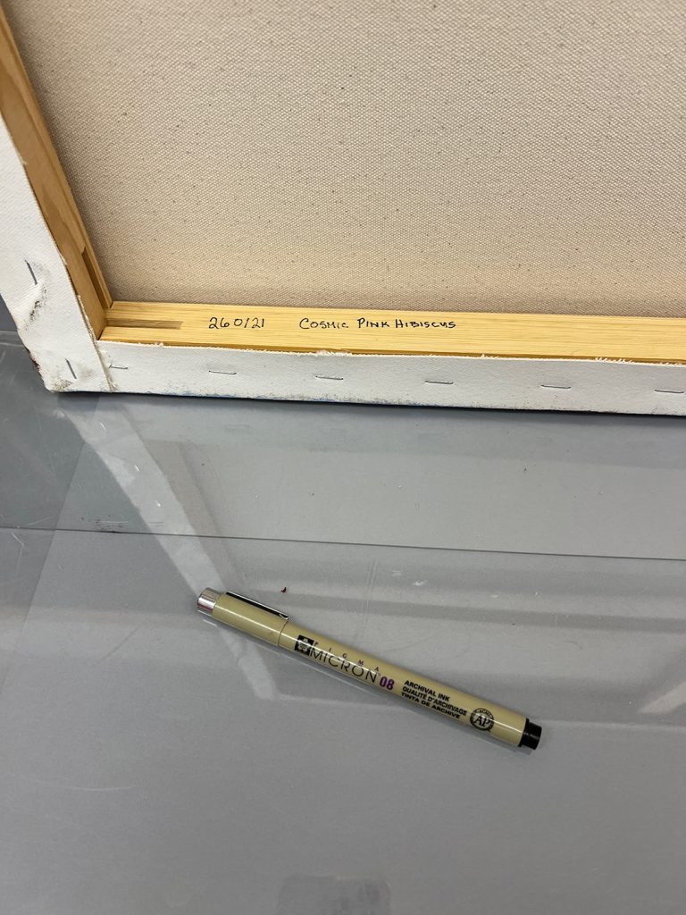 Another thing I do when I finish a painting is to write the Index # I’ve assigned to the artwork, the title, size, and medium. I also write the “© Mary Ahern” copyright insignia and sign my official signature on the wooden stretcher bars at the back of the canvas.