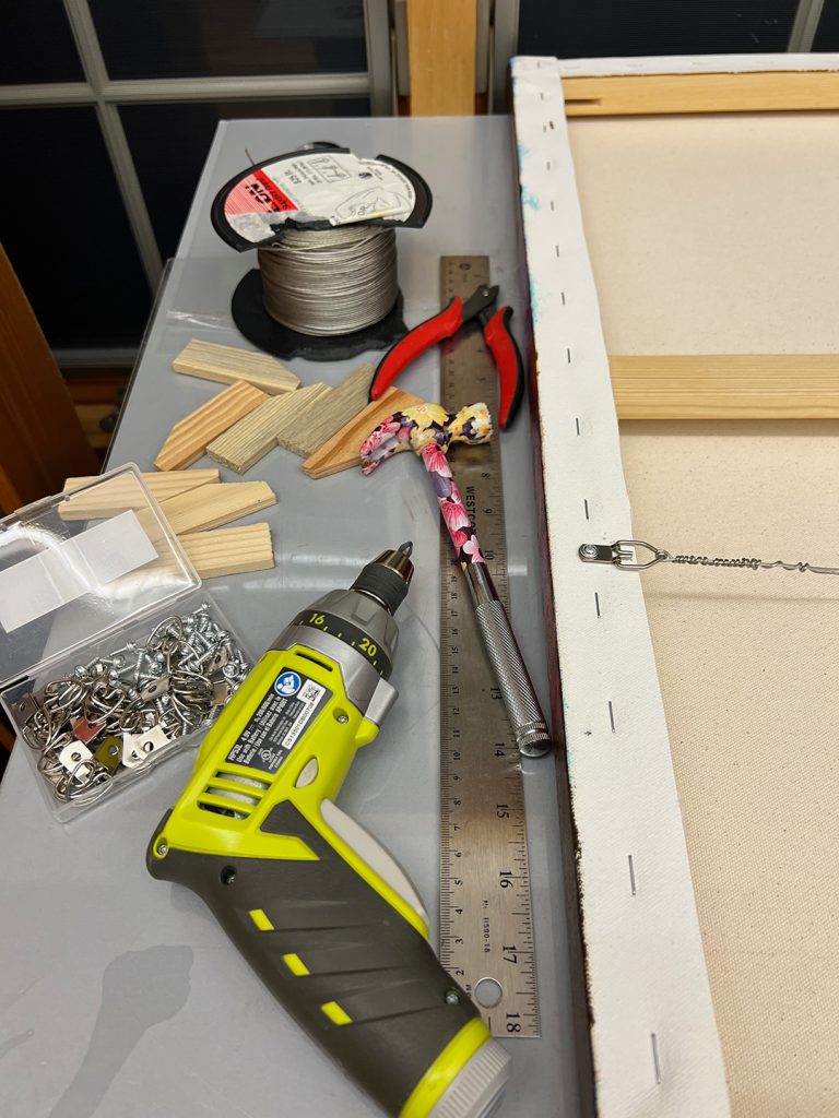 There are more tools that you need in the studio besides paint and brushes. After you finish a painting, there are additional tasks that need attending. One of them is preparing the painting for hanging on the walls. For that, one needs what’s called D hooks with screws, a ruler and marker to know where to put the screws & hooks, a drill to make holes in the wooden stretchers & tighten the. screws, wire to string from the D hooks, and a wire cutter for obvious reasons. I’m glad I found a very lightweight battery-operated drill quite a while ago, since it’s easy to handle and less dangerous around delicate artwork.