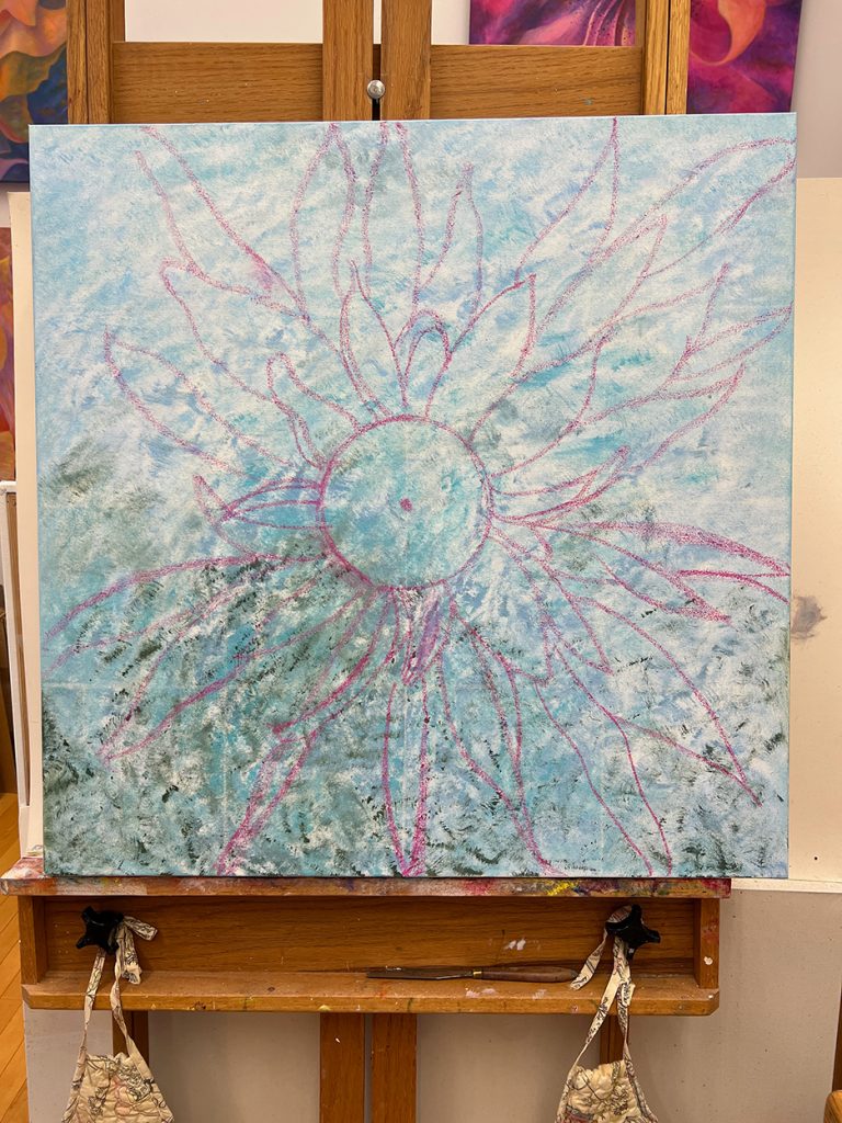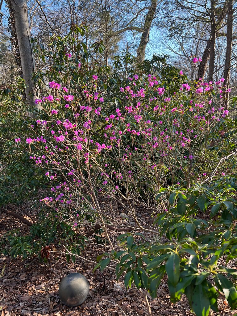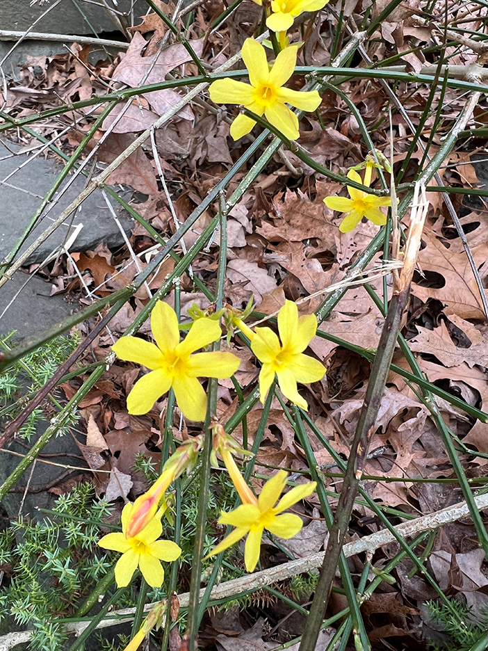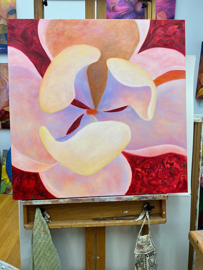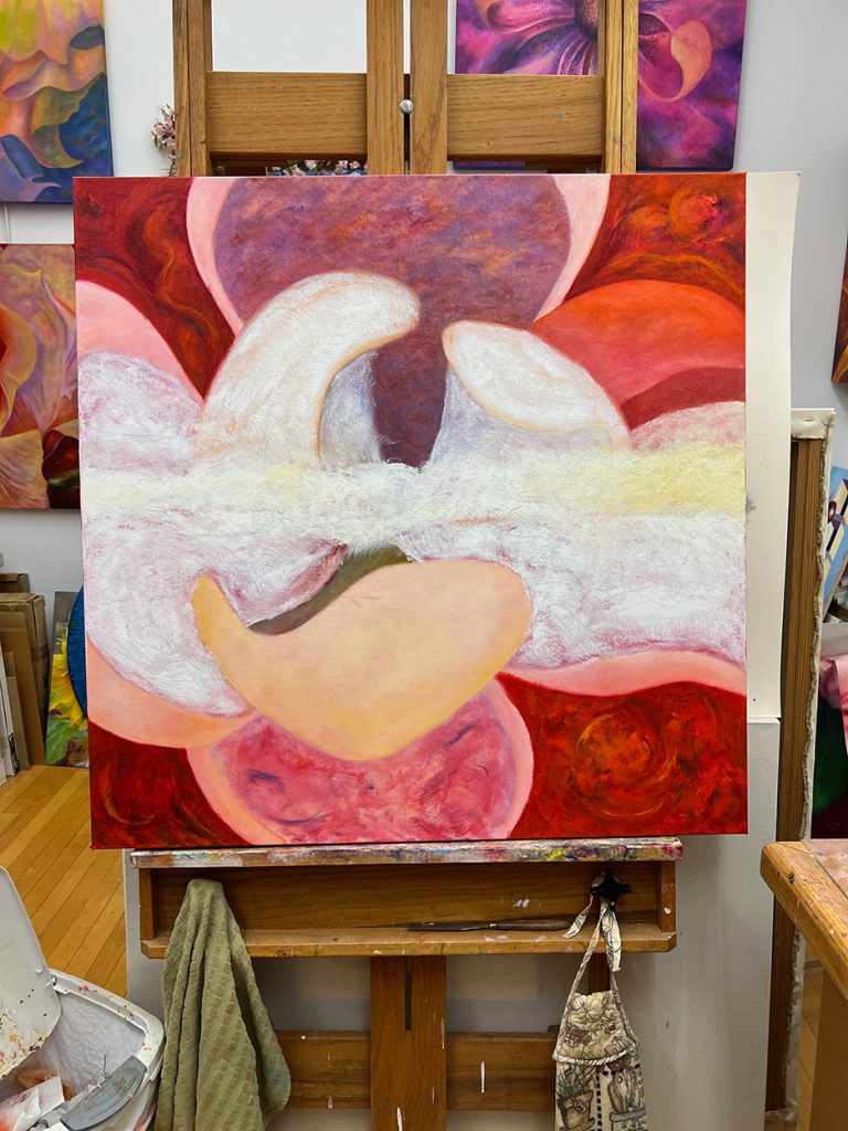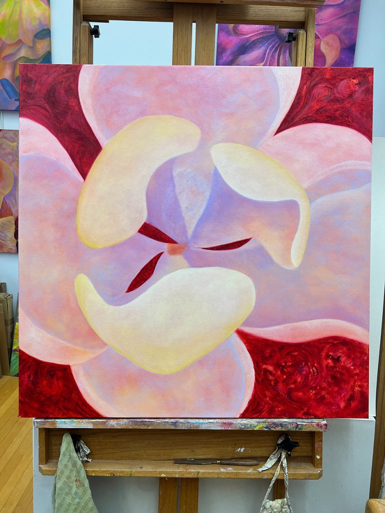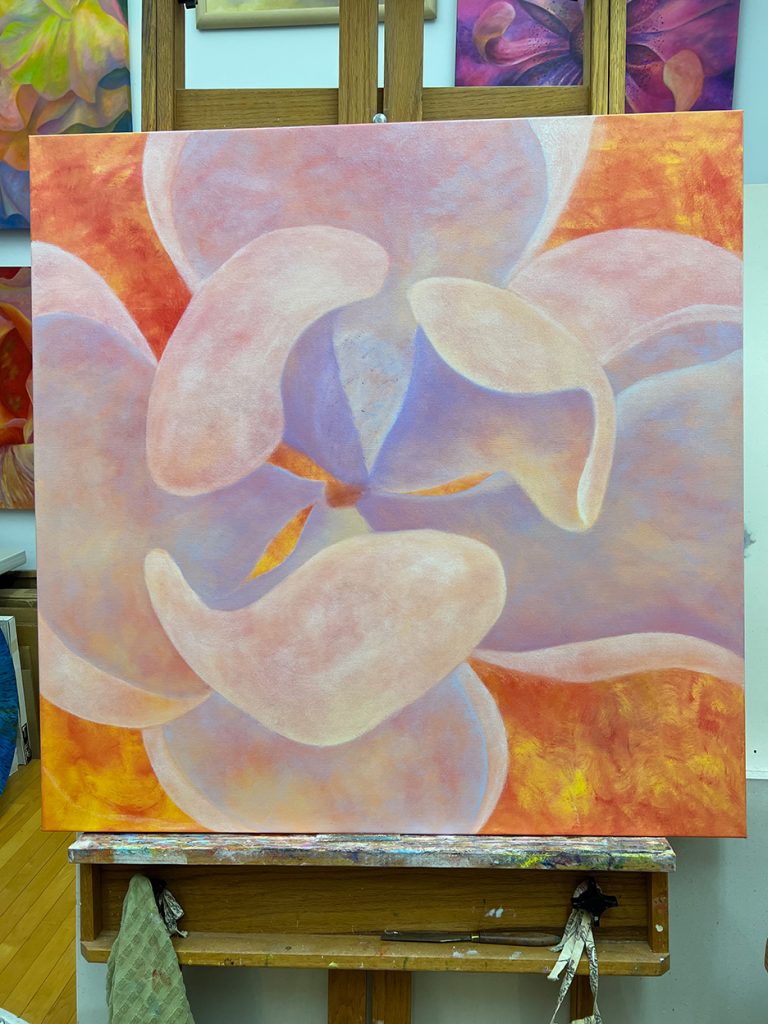 A beautiful spring day. The first time the temps reached into the 70s for the season and the first day without a jacket. I strolled out to my garden to gain some calmness and inspiration. I always find myself calming down when I walk around my garden, seeing the many small changes each day. The Jasminum nudiflorum, commonly called winter jasmine, was in bloom. The lilac colored Rhododendron mucronulatum finally popped into bloom. It. Was a little later than usual. This plant was on the property when I bought the house in 1989, and I’ve moved it a few times, like I do with many of my plants. It loves where it lives now and so do I. In the studio, I immersed myself in another type of flower. This dahlia oil-painting is starting to come to life. It’s beginning to speak to me and tell me what it plans to be.
