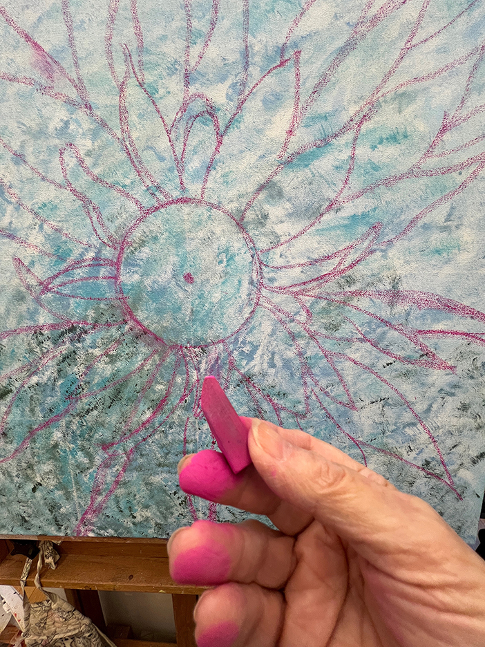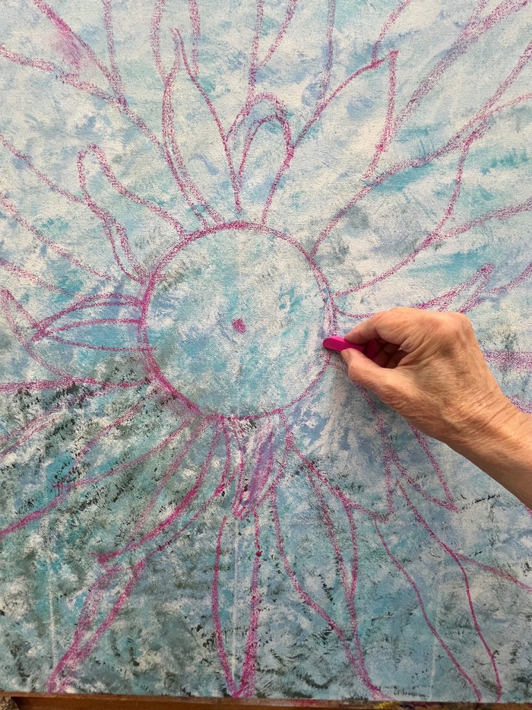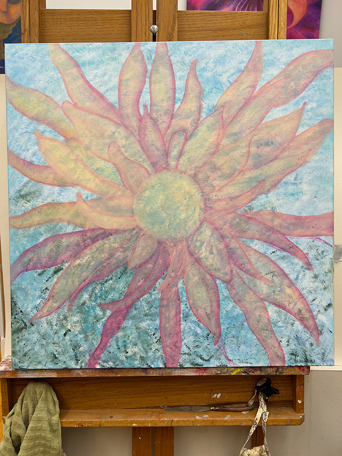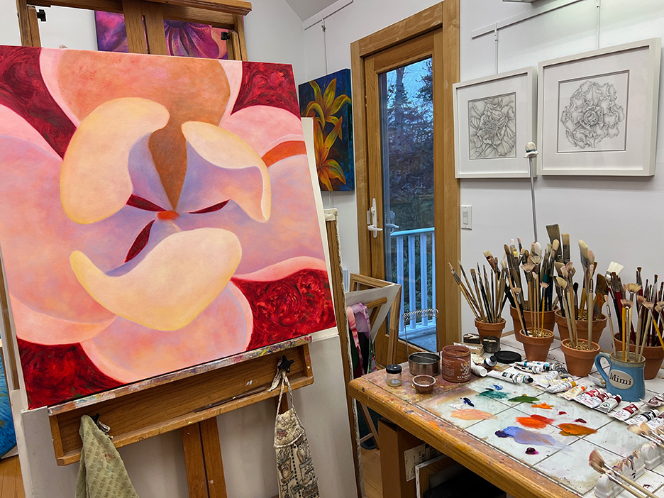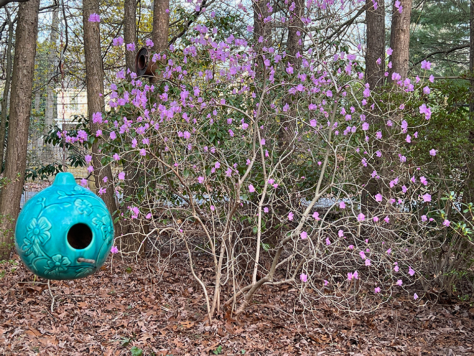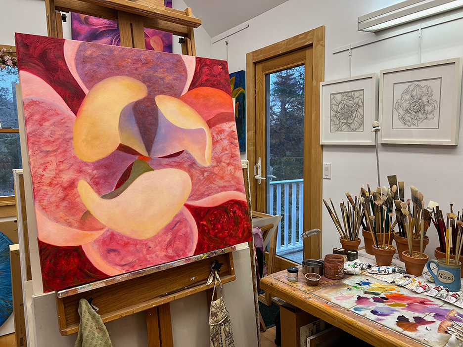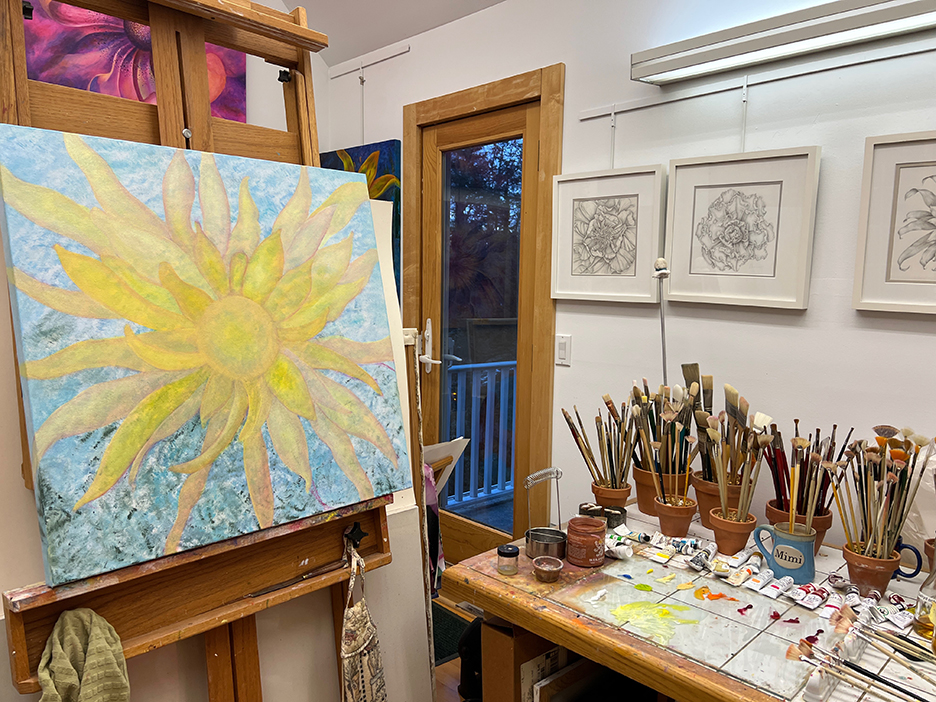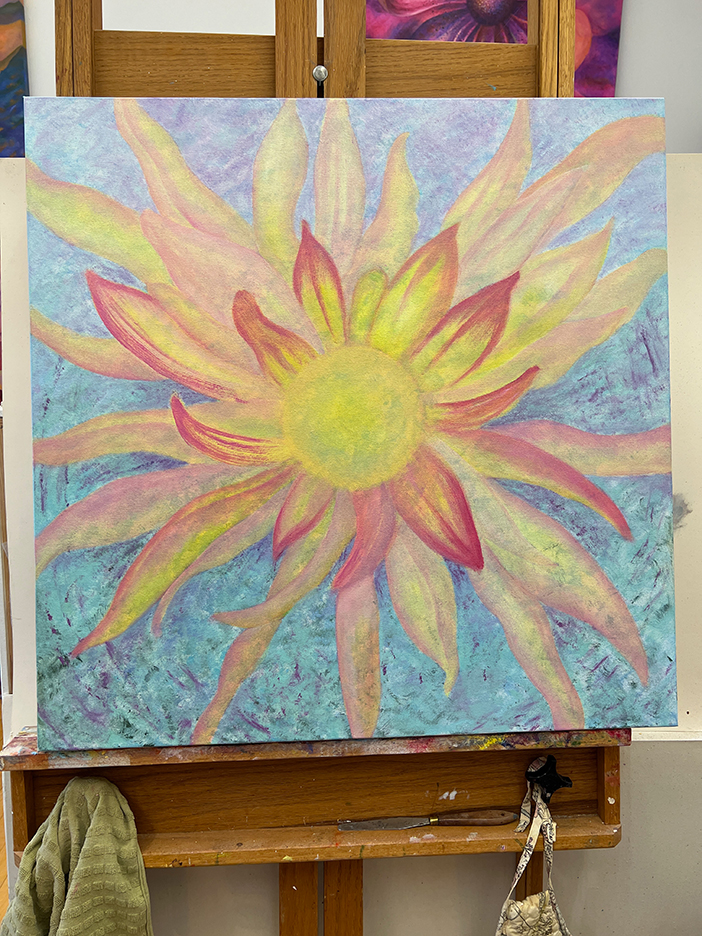 A beautiful spring day. The first time the temps reached into the 70s for the season and the first day without a jacket. I strolled out to my garden to gain some calmness and inspiration. I always find myself calming down when I walk around my garden, seeing the many small changes each day. The Jasminum nudiflorum, commonly called winter jasmine, was in bloom. The lilac colored Rhododendron mucronulatum finally popped into bloom. It. Was a little later than usual. This plant was on the property when I bought the house in 1989, and I’ve moved it a few times, like I do with many of my plants. It loves where it lives now and so do I. In the studio, I immersed myself in another type of flower. This dahlia oil-painting is starting to come to life. It’s beginning to speak to me and tell me what it plans to be.