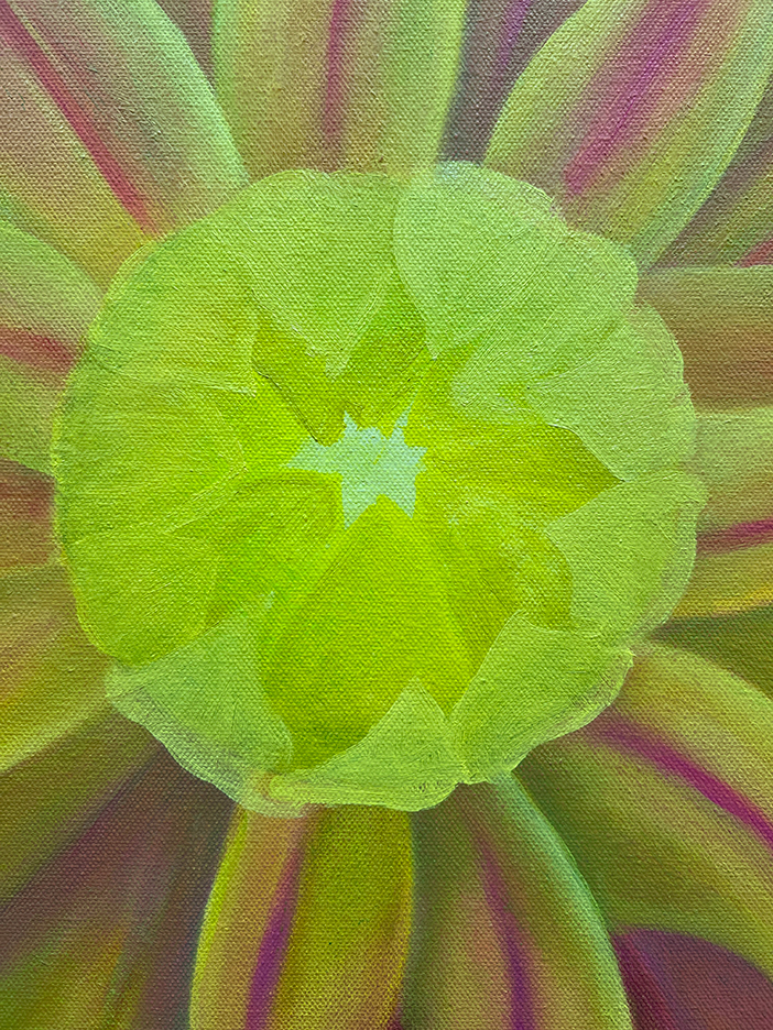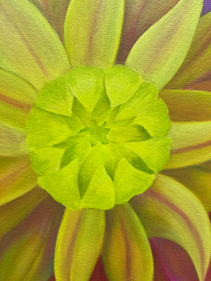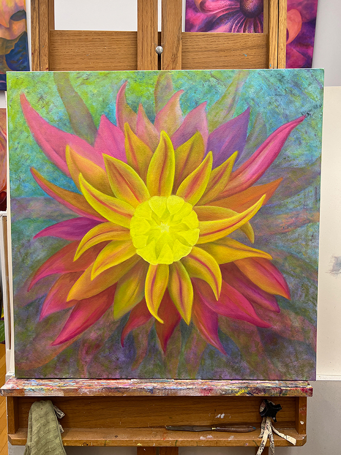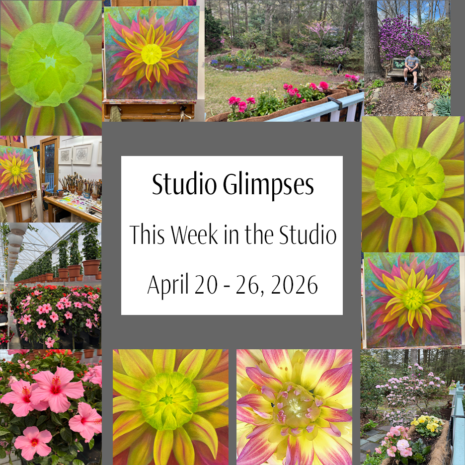 Weekly Wrap-Up: The dahlia painting is closing in on a decision point — not finished, but approaching what mathematicians call an asymptote, where each session brings only the smallest of changes. This week brought glazing, compass work to recenter the flower, and careful attention to the intricate architecture of the center petals. Meanwhile, the garden is in full spring stride: pastels in the deck planters, a now-towering rhododendron that was once a gift from the Rhododendron Society, and a lemon-green haze of new growth everywhere. A trip to the wholesale nursery fed the creative well, and a brunch with my grandson CJ was the kind of time that refills everything.