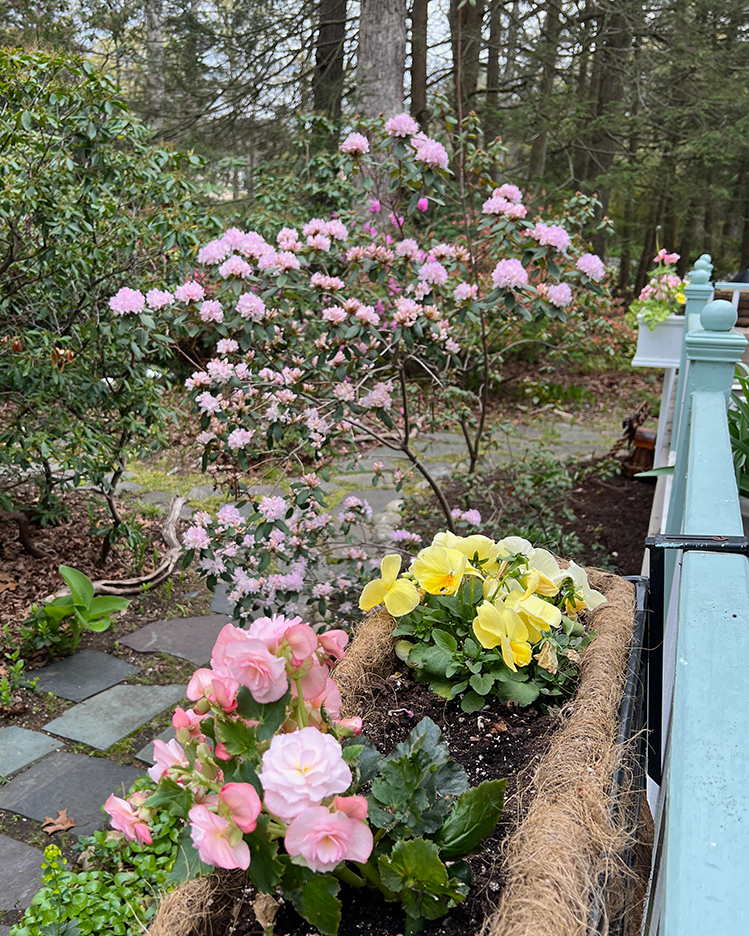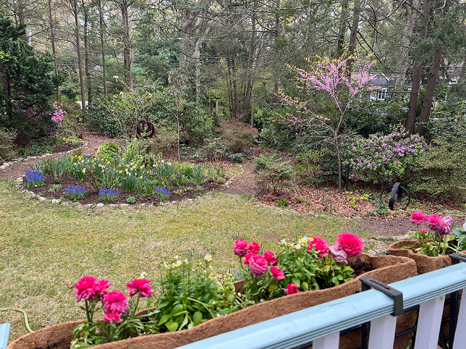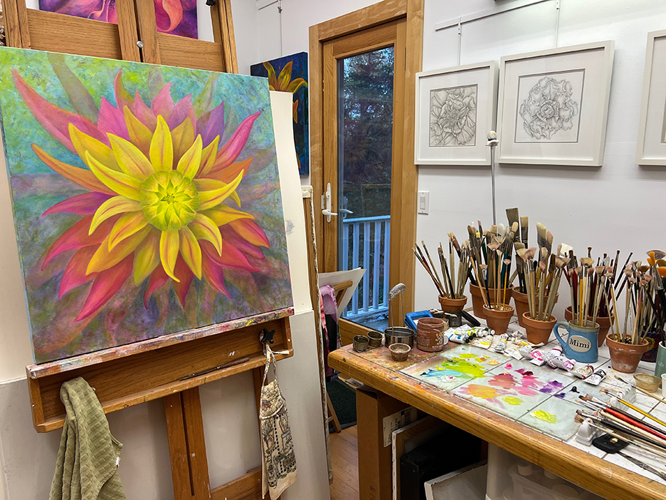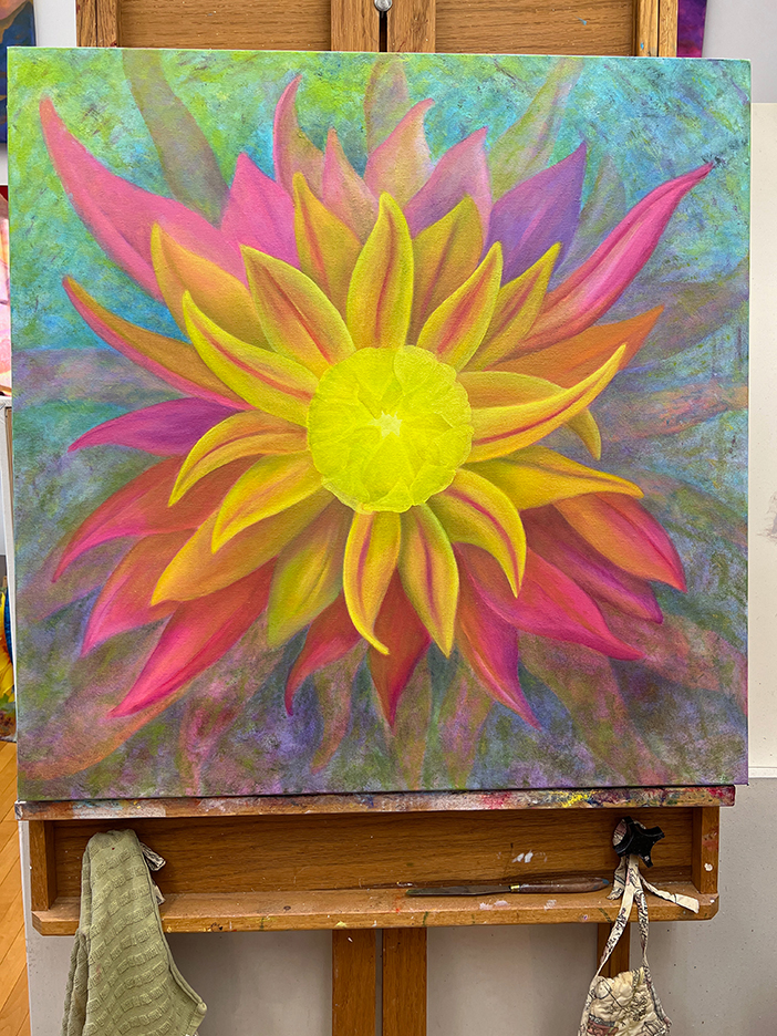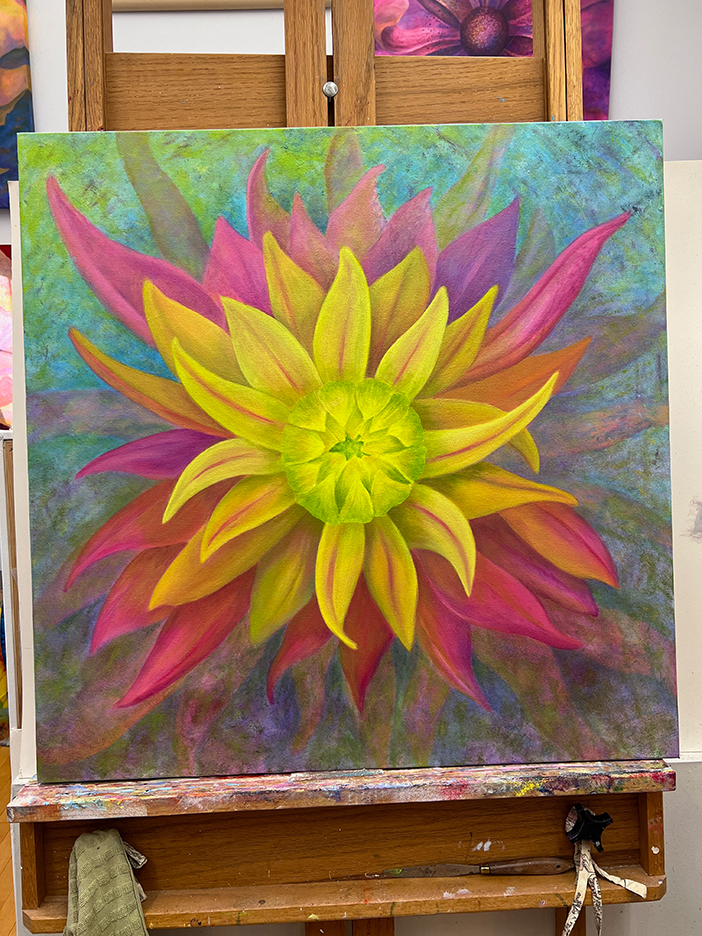 Weekly Wrap-Up: The dahlia painting is closing in on a decision point — not finished, but approaching what mathematicians call an asymptote, where each session brings only the smallest of changes. This week brought glazing, compass work to recenter the flower, and careful attention to the intricate architecture of the center petals. Meanwhile, the garden is in full spring stride: pastels in the deck planters, a now-towering rhododendron that was once a gift from the Rhododendron Society, and a lemon-green haze of new growth everywhere. A trip to the wholesale nursery fed the creative well, and a brunch with my grandson CJ was the kind of time that refills everything.