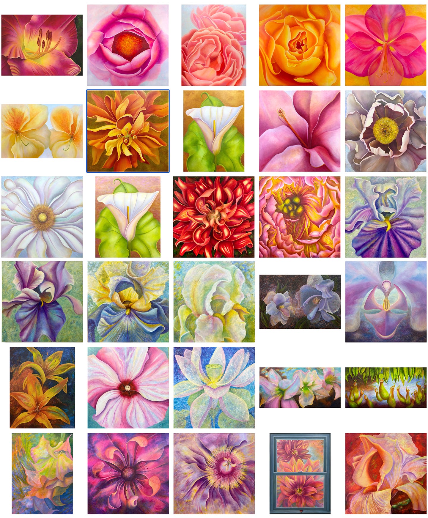 A few years ago, having made a conscious decision to calm the hectic pace of my life, close down the commercial side of my art, and spend more time creating for myself, my artwork changed yet again. I returned to my first love, oil painting. This decision also allowed more quiet time for reading, reflecting, and listening. As I continued to evolve, spiritual and intellectual awakenings increasingly inform more of my work. Embedded in my large flower paintings are layered the ideas and emotions surfacing in me at that moment. Tomorrow or next week, I might be thinking other thoughts, and my art will follow that thread of ideas.