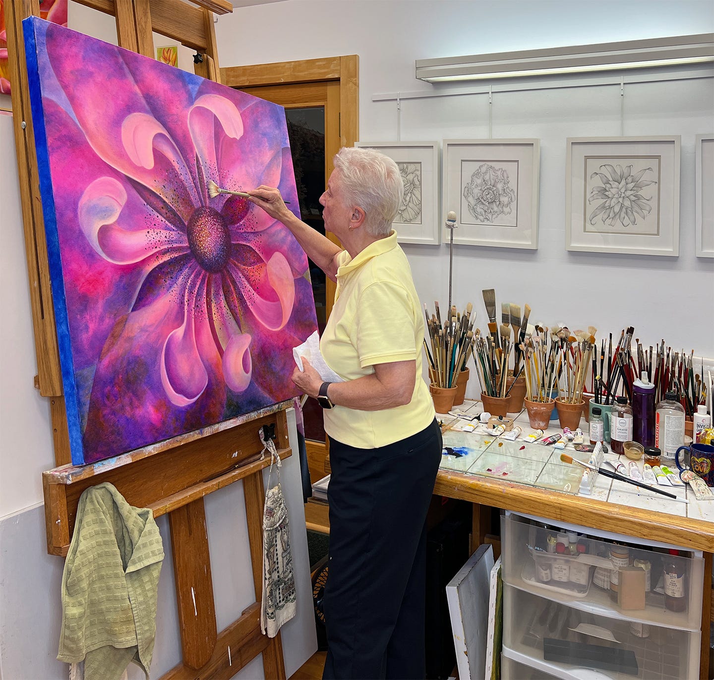 Most days, I wake up without an alarm, and before I get out of bed, I enjoy a 30-minute stretching and meditation routine. Then I shower, have coffee & read the news on my laptop. Each day that the weather permits, I spend time in my garden either working, photographing, or just seeing and enjoying. By mid-afternoon, I head to my studio for hours of painting or drawing.
